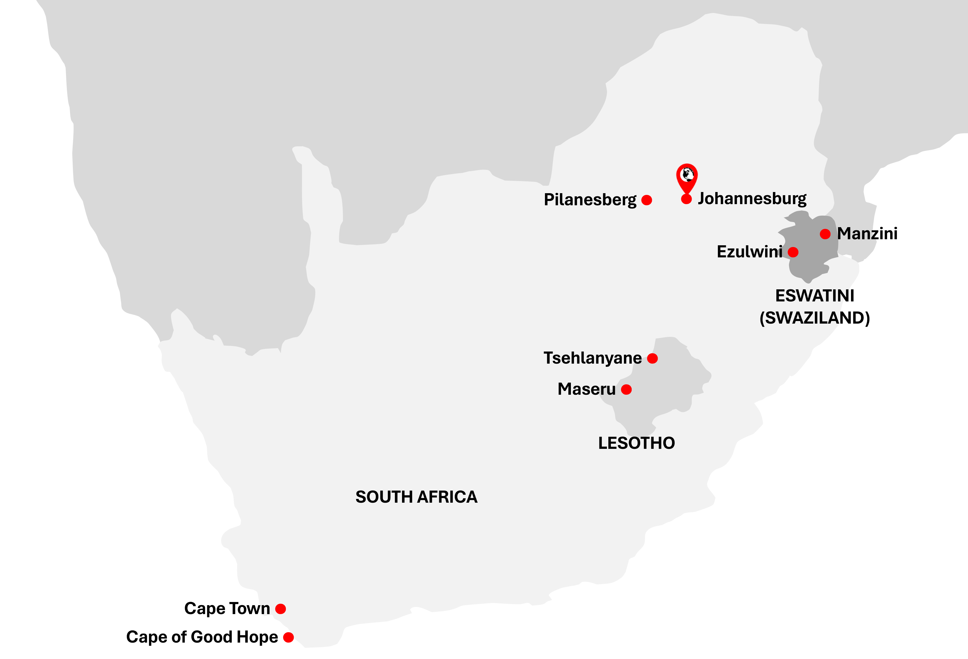 Where: Johannesburg, Pilanesberg & Cape Town, South Africa. Tsehlanyane & Maseru, Lesotho. Ezulwini & Manzini, Swaziland (Eswatini).